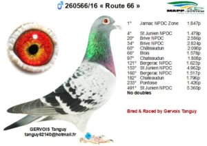 Chaque week-end depuis sa première licence en 2013, il amène ses pigeons au club « le ramier ». Tanguy, joue toutes les catégories, vieux, 1 ans, femelles (au veuf) et Jeunes. Il se passionne pour les concours de demi-fond et les 500 à 650 km. Il se laisse quand même, parfois, tenter par les concours de grand-fond que propose le CALC. Et avec succès puisqu’il remporte en 2018 le concours de Cahors en 2017 (692 km) du Calc, catégorie femelle, avec une pigeonnelle joué sur un petit jeune. Mais de son propre aveu, ce n’est pas le genre de concours qu’il l’intéresse vraiment.