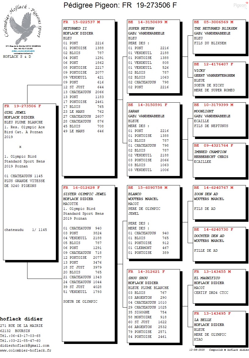 Origines de ses pigeons : Casaert , Georges Bolle , Noel Lippens , Chris Hebberecht , Frans Bungenners , Gaby Vanvenabeele