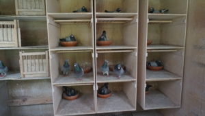 Dans le pigeonnier de jeux il y a quatre compartiments avec trois équipes de veufs (16+8+8) et un compartiment de 32 jeunes. Les origines ne sont pas innombrables « J’ai très peu acheté », des pigeons venant évidement de chez Christian Witendal, José Mesa, André van Caeneghem, Roger Bayard « et récemment je me suis fait plaisir et j’ai acheté chez un amateur belge en 2015 : Monsieur Vandemeulebroecke ».
