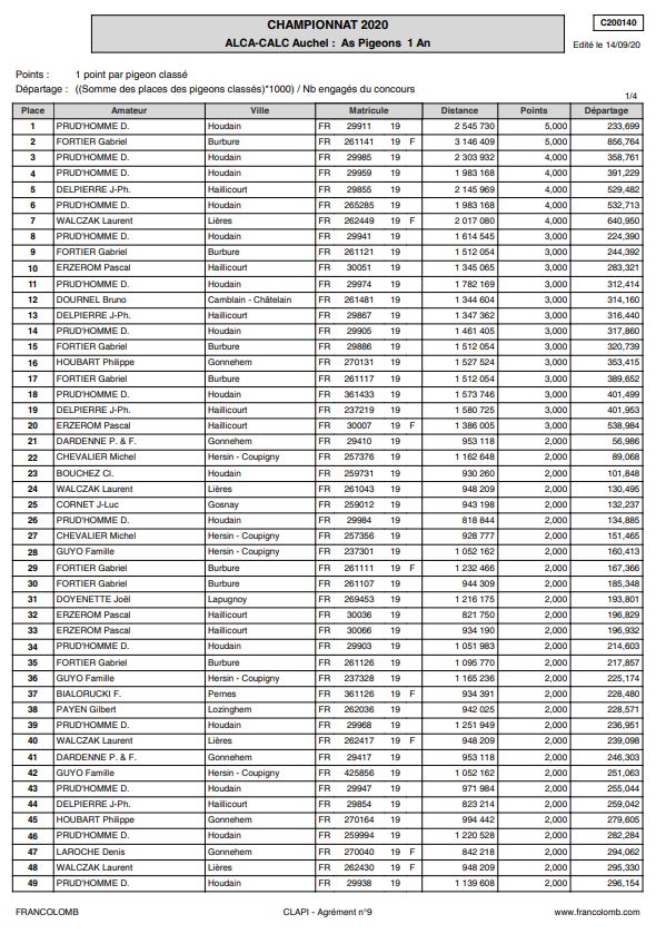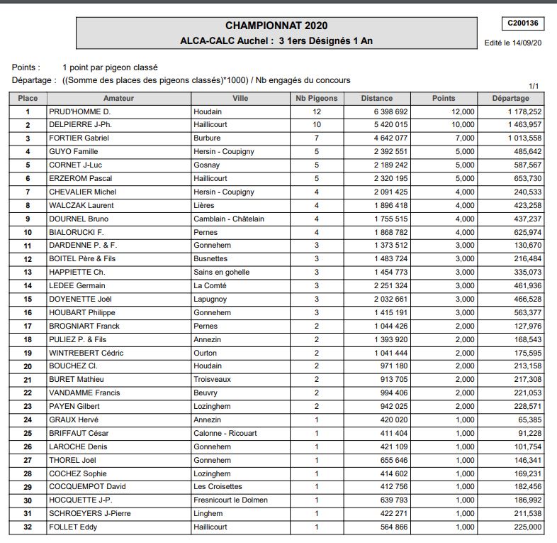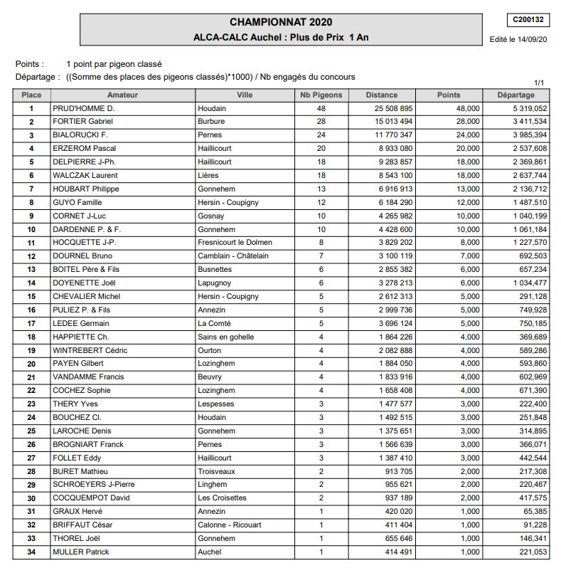 Publié le23/09/2020Championnat 2020 « Alc Calc Auchel » Groupement de Béthune3 1er Désignés 3 1er Désignés 1An 3 1er Désignés Vieux 3 1er Désignés Jeunes 3 1er Désignés Femelles As Pigeon : As Pigeon 1An As Pigeon Vieux As Pigeon Jeunes As Pigeon Femelles Plus de Prix : Plus de Prix 1An Plus de Prix Vieux Plus de Prix Jeunes Plus de Prix Femelles PartagezTweetezPartagez