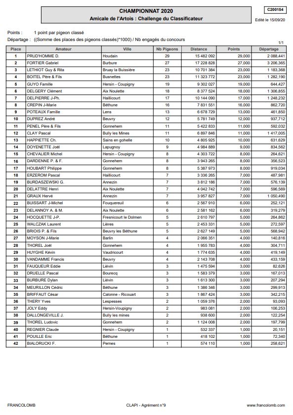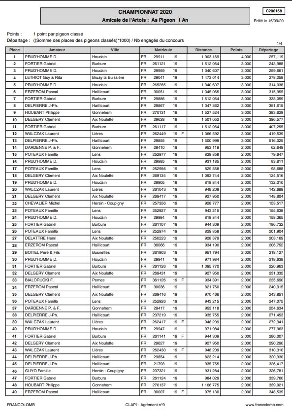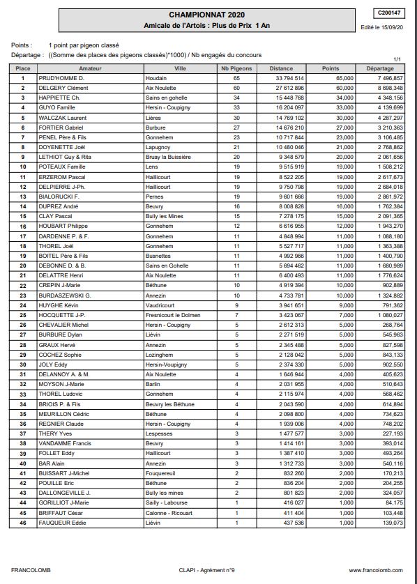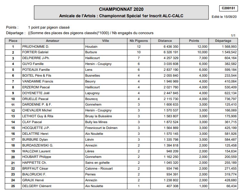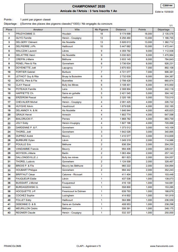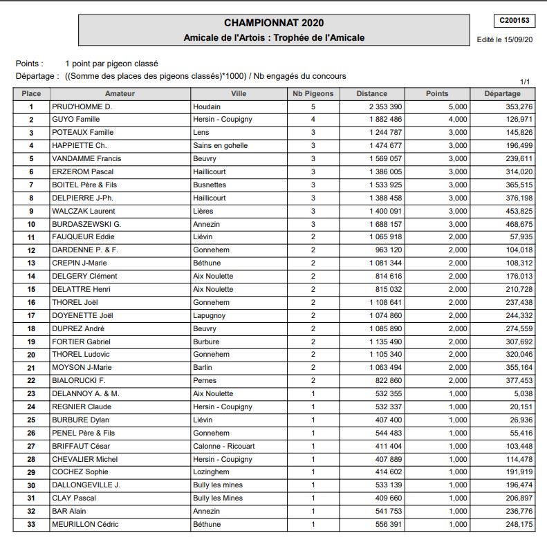 Publié le23/09/2020Championnat 2020 « Amicale de L’Artois » Groupement de Béthune3 1er Inscrit : 3 1er Inscrit 1An 3 1er Inscrit Vieux 3 1er Incrit Jeunes 3 1er Inscrit Calc 3 1er Inscrit Fédéraux As Pigeon : As Pigeon 1An As pigeon Vieux As Pigeon Jeunes Challenge : Challenge du Classificateur Challenge Emmanuel Guyo Challenge Hervé Briois Championnat : Championnat Special 1er Inscrit Calc Championnat Special 1er Inscrit Fédéraux Plus de Prix : Plus de Prix 1An Plus de Prix Vieux Plus de Prix Jeunes Trophée : Trophée de L’Amicale PartagezTweetezPartagez