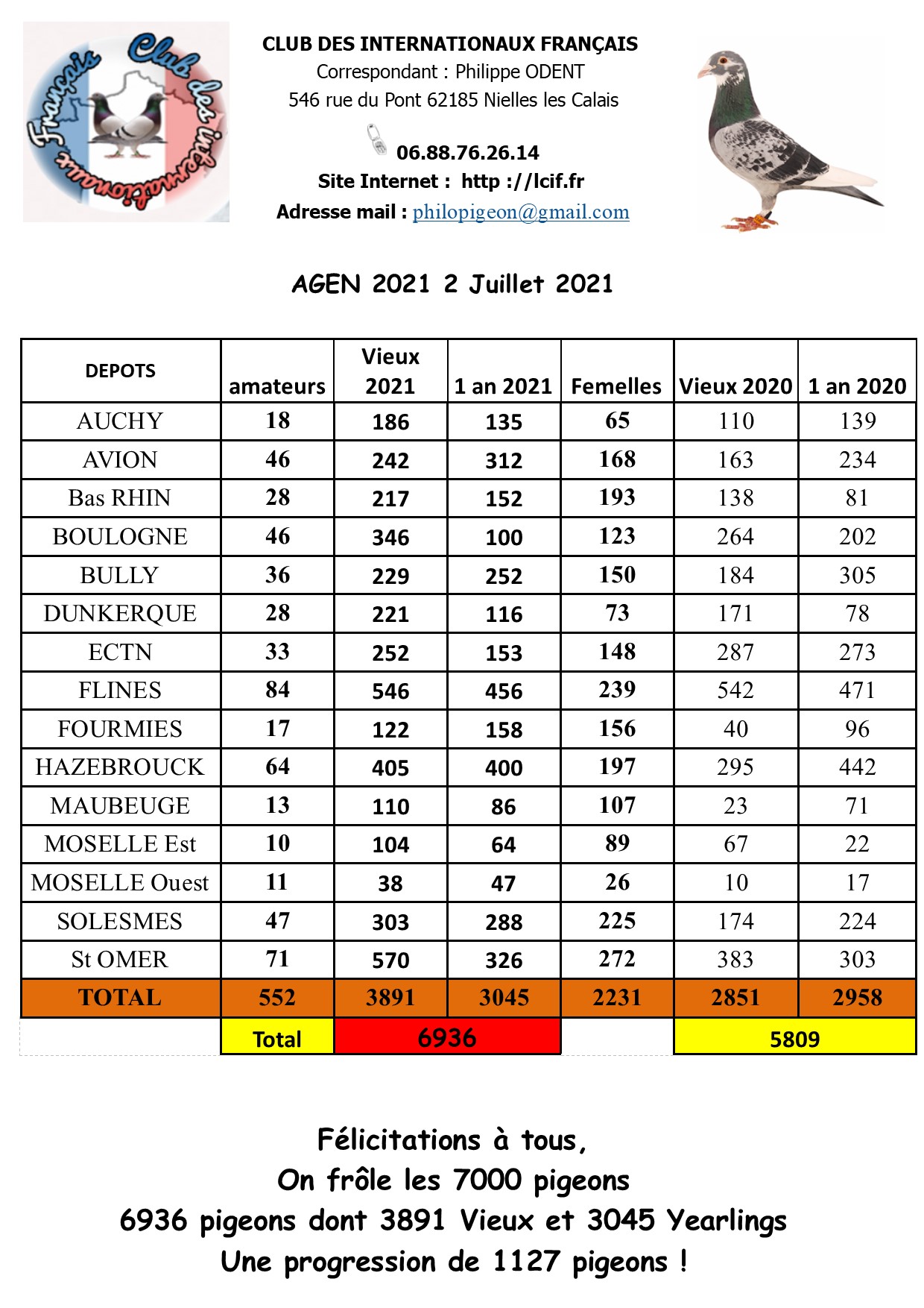 Encore un succès pour les organisateurs et les équipes de bénévoles du CIF, pour cette édition d’Agen 2021, nous sommes à deux doigts des 7 000 pigeons, c’est beaucoup (3891 vieux, 3045 yearlings et 2231 femelles). Surtout qu’il ne faut pas oublier qu’une bonne partie des joueurs de l’avant sont privés de cette étape car ils n’ont pas la distance minimale requise (700 km). Ça fait du monde dont le vainqueur International français de Mont de Marsan 2021 et des champions comme Jean Pachla, Eric Vanacker, Richard Rogé, Gérard Ledoux et bien d’autres…