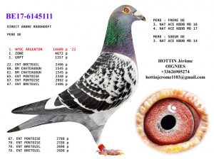 Avant de partir pour Argenton l’équipe de vieux avait fait 4 concours de vitesse « Ils ne sont pas allés en demi-fond (Châteaudun) à cause du temps ». Le premier (344810) est un pigeon régulier, blessé à la gorge l’an dernier, il a pu se révéler cette année. C’est un pigeon vif et extrêmement curieux, c’était le premier arrivé lors des deux derniers concours de vitesse précédant Argenton. D’ailleurs Jérémy a eu un problème avec son constateur électronique « le temps de régler mon problème d’électronique le 810 a perdu des places dans le classement, vu l’heure il était en tête, mais seule la constatation fait foi ! »