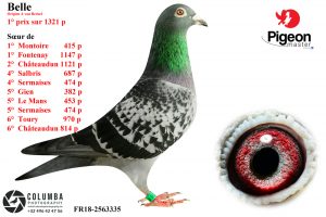 Belle est une superbe femelle écaillée, c’est une pigeonne de taille moyenne, bien équilibrée possédant une très forte vitalité, son ossature est solide malgré une fourche arrière ouverte Belle à une robe superbe, un plumage très épais, très doux avec hue bonne couverture sous l’aile. Son bras est court, son dos est fort ce qui fait qu’en main nous avons une pigeonne très puissante. Seulement jouée en jeune, elle a un premier prix à son actif sur 1321 pigeons. ! Cerise sur le gâteau elle la demi-sœur de l’As-pigeon de demi-fond du sous groupement de Dunkerque 2022 ! Ses deux parents sont des achats directs au colombier A van Berkel. Son père Le Kleine Shinnig Star NL14-1034884