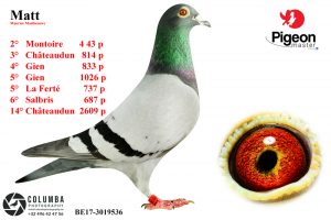 Encore un pigeon au palmarès éloquent, Matt est le favori d’Hervé, (petite étoile) est un superbe mâle, plein de vitalité, de taille moyenne bien équilibré, très solide avec une fourche arrière bien fermée. Matt a un super plumage, très épais, et soyeux. Grâce à son dos fort, nous sommes en présence d’un pigeon puissant. Son père le Top Sturen, BE15-3075273 est le fils d’un des meilleurs reproducteurs de la colonie Maurice Mattheeuws de St-Kruis/Brugge (BE), De Sturen , frère de nid d’un véritable crack qui gagna plus 70 prix simple sur toute sa carrière remportant des concours sur Arras, Clermont, Ablis, Bourges et Tours.