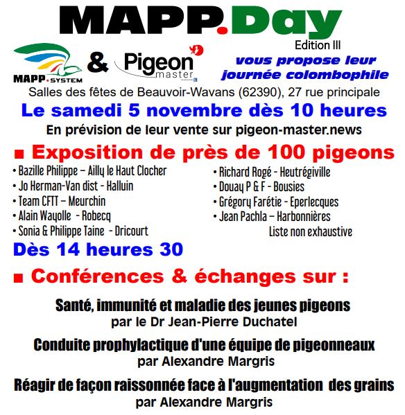 Samedi 5 Novembre MAPP System et Pigeon-Master s’associent pour organiser la troisième édition MAPP Day à la salle des fêtes de Beauvoir-Wavans (62). Au programme, une exposition des pigeons qui seront présentés aux prochaines ventes Pigeon-Master et une série de conférences animées par Alexandre Margris et le docteur Jean-Pierre Duchatel. Venez retrouver l’ambiance d’antan des ventes en salle avec prise en main.