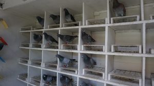Jeunes ou vieux, les pigeons sont sur caillebotis pour faciliter le travail avec toujours une petite planchette pour qu’ils puissent être à l’aise.
