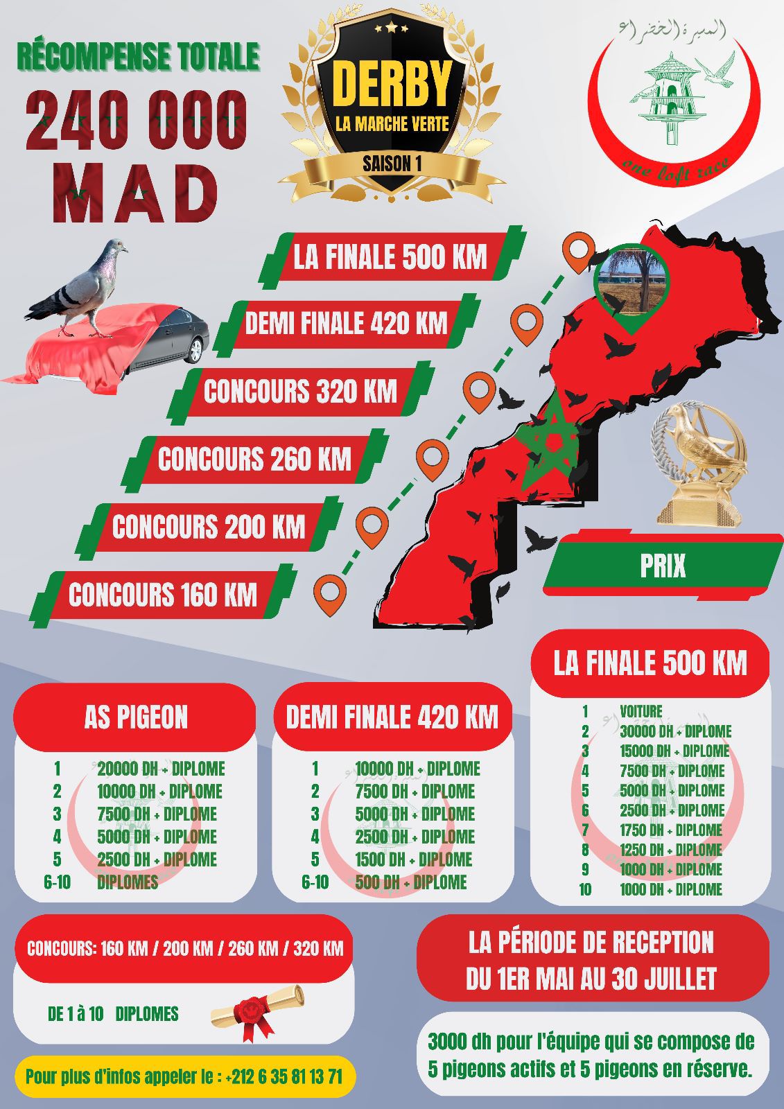 Des nouvelles de nos confrères Marocains maintenant avec la campagne de réception qui démarre pour le one Loft la marche verte, un moyen de transport est possible pour acheminer les pigeons vers le Maroc, pour plus de renseignements contactes Louay au 06.58.08.86.07, également possible par mail : contact@thinkinlynk.com. La campagne de réception des pigeonneaux s’étale du premier Mai au 30 Juillet.