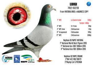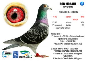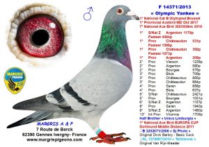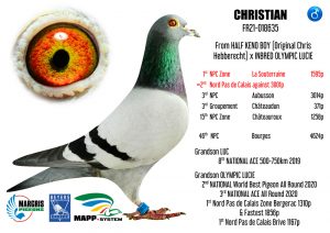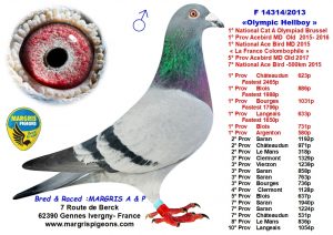 Les pigeons Margris s’exportent très facilement, voici quelques références. Après plusieurs As Européens femelles et sur St Vincent (50% Margris), le graal ultime avec l’As pigeon National Belge Long Distance Yearlings (50% Margris) chez Bart Geerinckx en 2022, cette année 2023 n’est pas en reste, voici quelques victoires (non exhaustives) :1er de la Demi-Finale du One Loft Viktoria Falls au Zimbabwe (Afrique) élevé par SG Miks (50%)